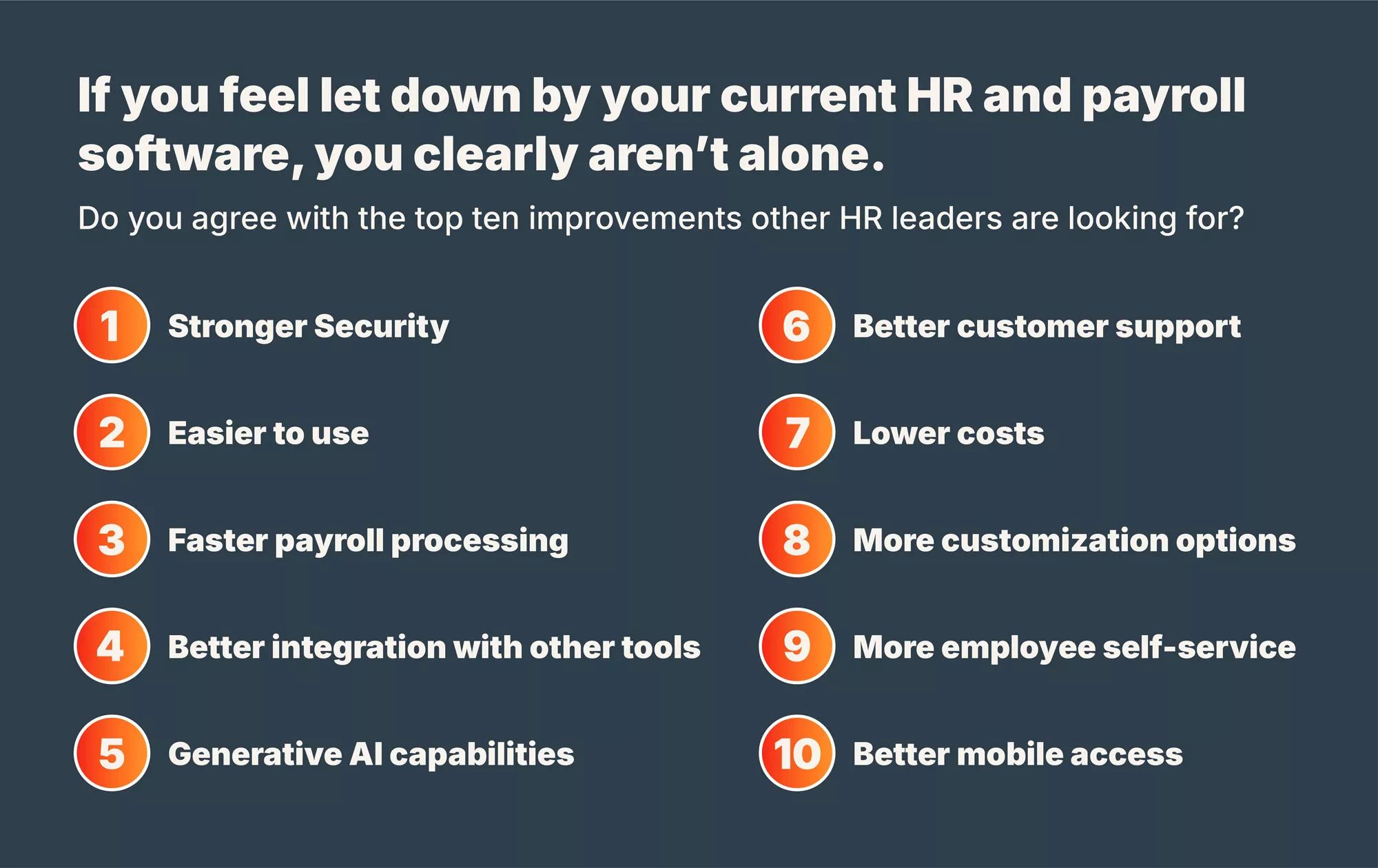 That means two out of every three HR leaders believe there are better options than what they’re currently using. They’re also willing to take on the task of implementing a new system and onboarding a new provider if it means finally having the tools they need to succeed.