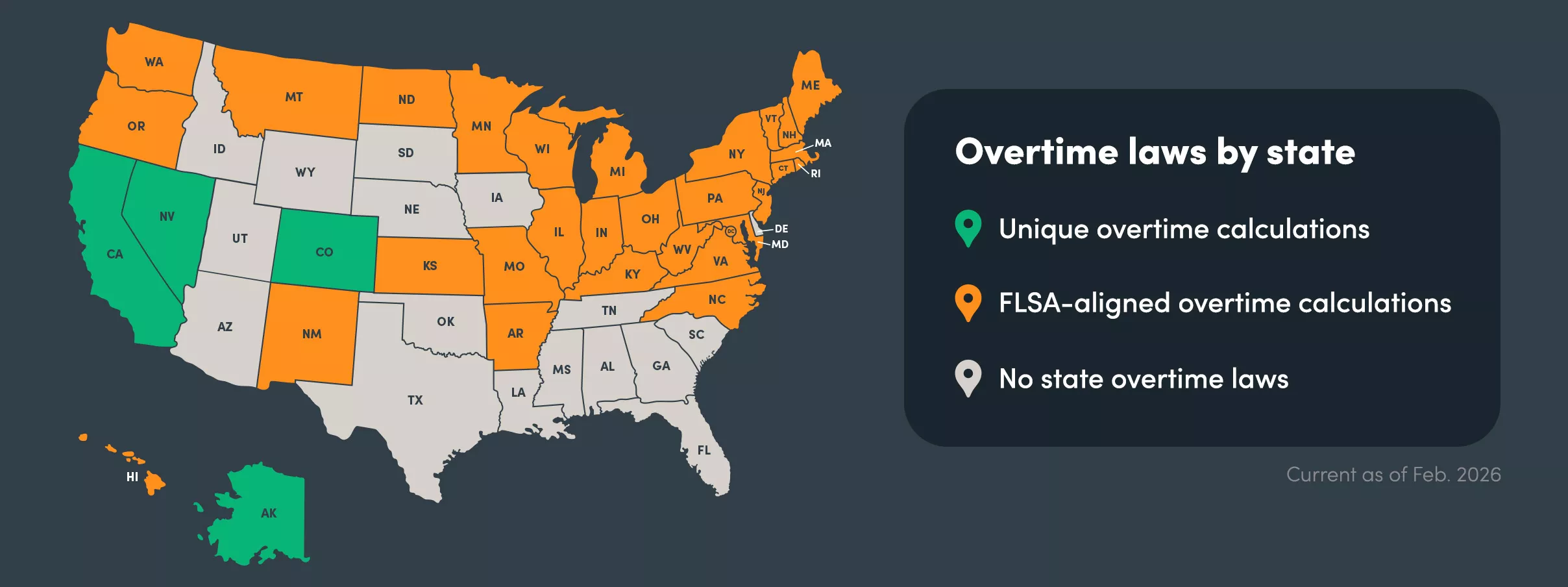 - Alongside federal overtime law, employers must also comply with varying overtime rules by state jurisdiction.