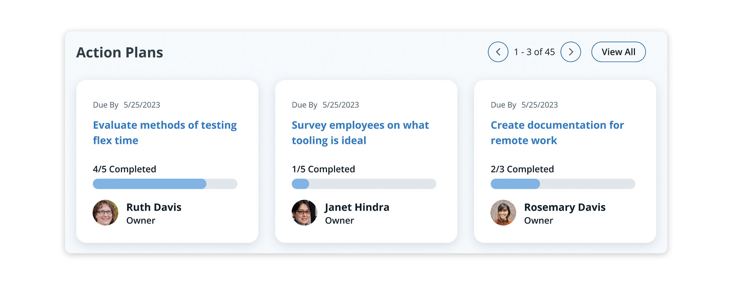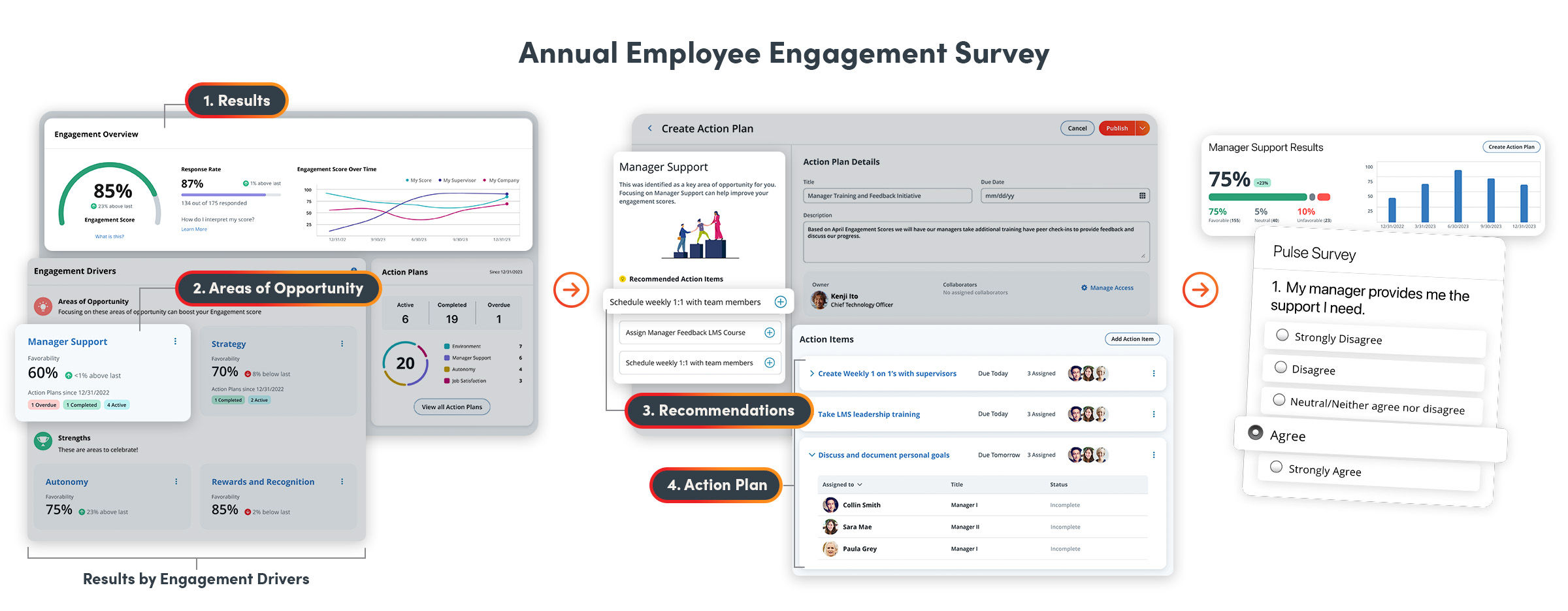 As you view progress on action plans, you can quickly see if your efforts are moving the right needles using pulse surveys.