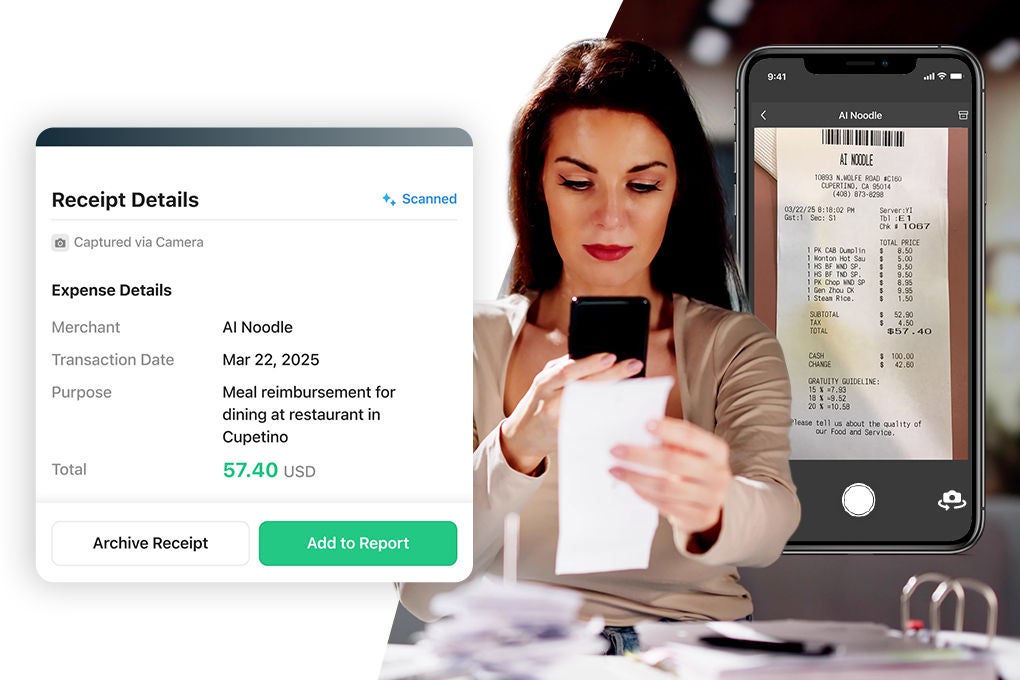 - Capture receipts with a snap of a photo and our AI-powered OCR automatically reads the vendor, date, and amount.